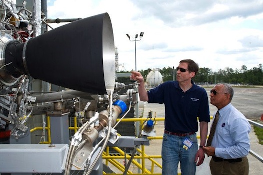 NASA's John C. Stennis Space Center:  NASA Administrator Charles Bolden (r) discusses the upcoming testing of Blue Origin's BE-3 engine thrust chamber assembly with Steve Knowles, Blue Origin project manager, on the E-1 Test Stand at NASA's Stennis Space Center. The BE-3 will be used on Blue Origin's reusable launch vehicle as part of the agency's Commercial Crew Development Program. Blue Origin is one of NASA's partners developing innovative systems to reach low Earth orbit.[/size]