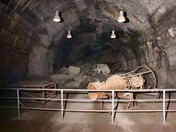 Image: This is a tunnel of the underground factory at the KZ Mittelbau. In the front is a incomplete engine of a V2 rocket, which was built in this factory.