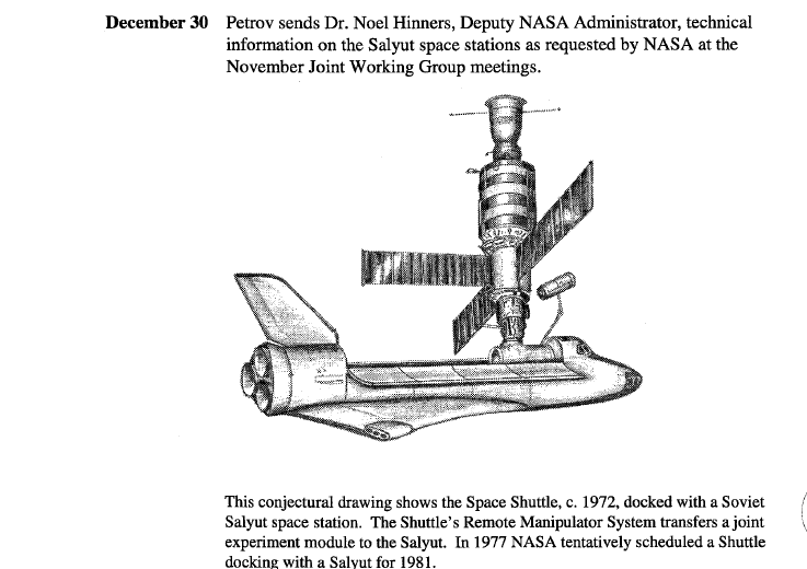 ЦитироватьВ ноябре 1977 г. была проведена первая встреча советских и американских ученых и специалистов для предварительного обсуждения проекта «Салют—Шаттл».