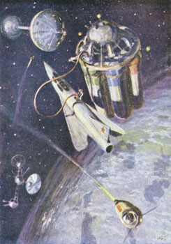 Н.Кольчицкий. Заправка межпланетного корабля на спутнике. Источник: К.А.Гильзин. Путешествие к далеким мирам. М., 1956