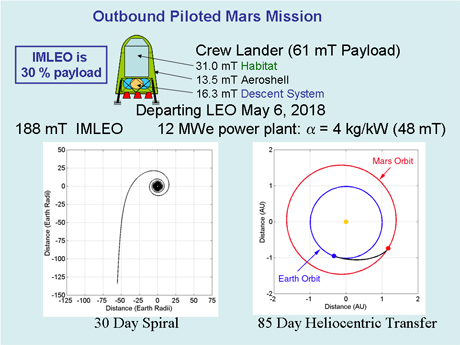VASIMR® propulsion system powered by a nuclear-electric generator. With 12 megawatts of electrical power, a ship could reach Mars in less than four months and with 200 megawatts of power the outbound trip could be as short as 39 days.