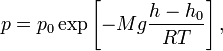 где p — давление газа в слое, расположенном на высоте h, p0 — давление на нулевом уровне (h = h0), M — молярная масса газа, R — газовая постоянная, T — температура в Кельвинах.