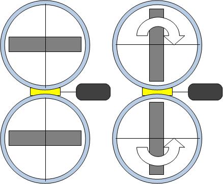 Слева - 2 маховика раскручиваются, раскручивая в нужную сторону и станцию, справа - те же маховики поворачиваются червячным редуктором на 180. Соответственно, моменты, создаваемые маховиками при повороте взаимно компенсируются, в сумме - нуль, зато после поворота - мы можем тормозить маховики (станция - продолжает раскручиваться), и дальше ускорять в ту же сторону. Получается - саморазгружающийся гиродин. Стоит добавить, что если скорости маховиков не равны, то при повороте их мы будем и станцию поворачивать (вокруг другой оси), так что, такое устройство пригодилось бы и на существующих станциях и спутниках для их стабилизации. Даже странно, оно то почему не используется :(