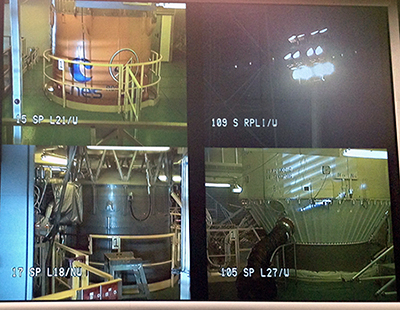 The Jupiter Mission Control center's split-screen display provides camera views of the Soyuz launch site in French Guiana, including close-ups of the vehicle's stages and payload fairing.