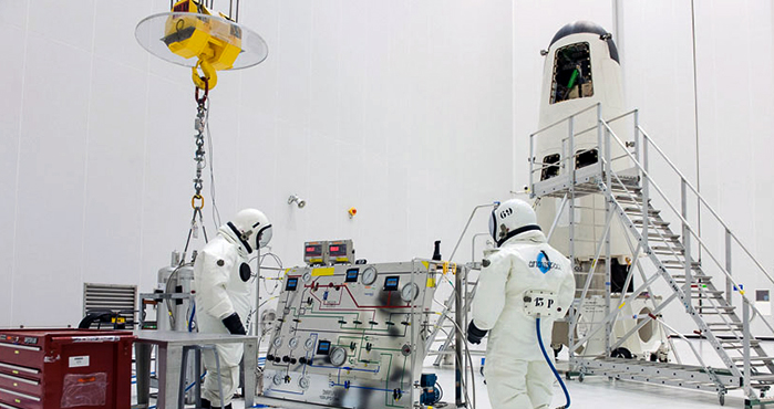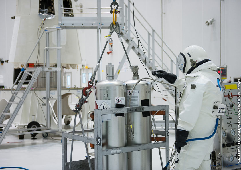 The loading of IXV's hydrazine maneuvering propellant was performed inside the S5B hall at Europe's Spaceport in French Guiana.