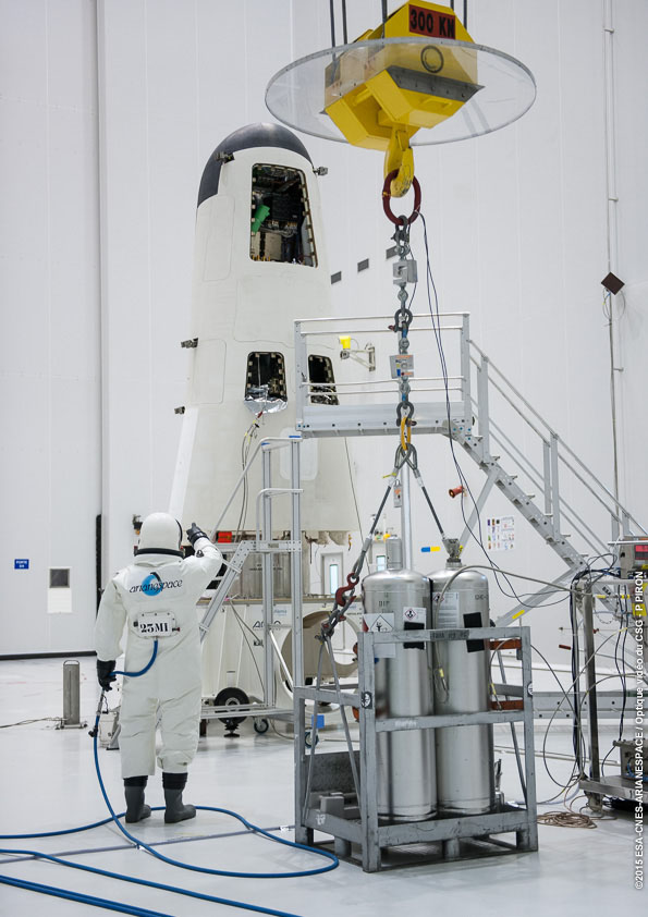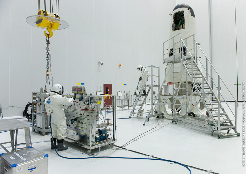 Loading of IXV's hydrazine maneuvering propellant was performed in the S5B hall of the Spaceport's large S5 payload preparation facility.