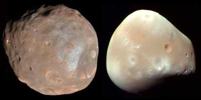 The surface of Phobos (left) is very different form that of the smaller Martian moon Deimos.