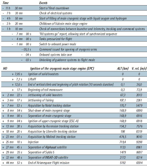 During the flight sequence, the payload fairing will be jettisoned first at approximately 3 minutes into the mission, followed by deployment of Alphasat at just under 28 minutes into the flight. The SYLDA dispenser is then to be released, allowing the subsequent separation of INSAT-3D to complete the Arianespace mission 32 minutes after liftoff.