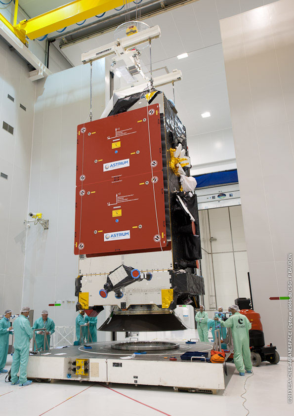 Encapsulated in its ogive-shaped protective fairing, Alphasat was lowered into place yesterday over INSAT-3D – which was installed atop Ariane 5's cryogenic core stage during activity earlier in the week.