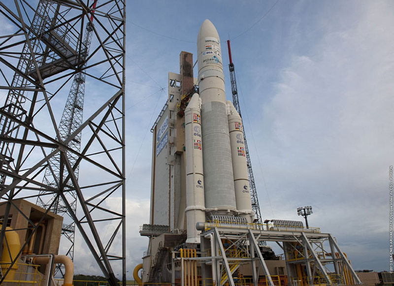 Ariane 5 is shown in the ELA-3 launch zone prior to its liftoff on a successful flight that orbited Alphasat and INSAT-3D.