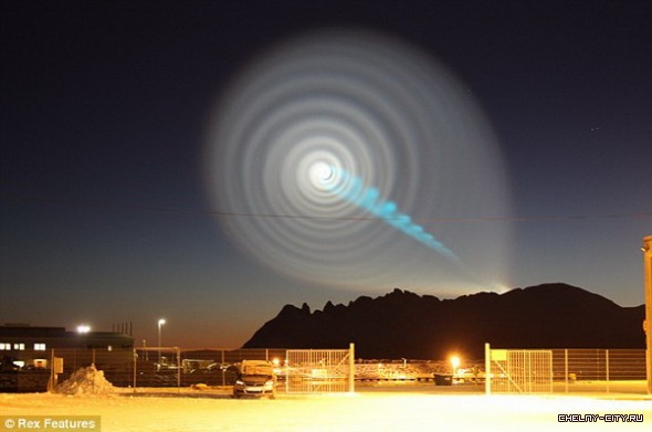 Таинственное сине-белое спиральное сияние в небе заставило удивиться жителей Норвегии. Пучок синего света,