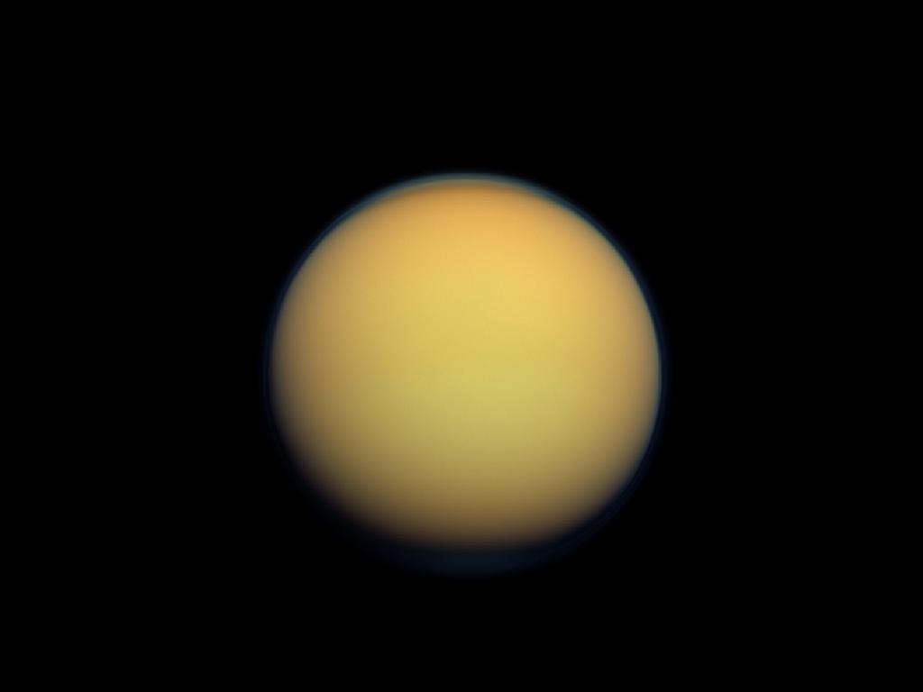 ЦитироватьTitan's atmosphere makes Saturn's largest moon look like a fuzzy orange ball in this natural color view from the Cassini spacecraft.