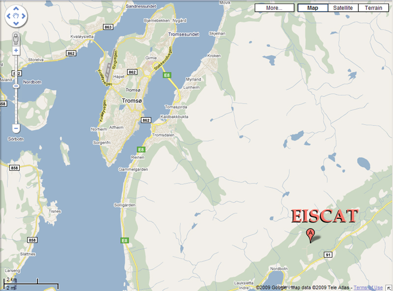 Немногим известно, что там же, в Норвегии, рядом с г. Тромсе, распо­лагается европейский комплекс по исследованию ионосферы EISCAT (European Incoherent Scatter Radar).
