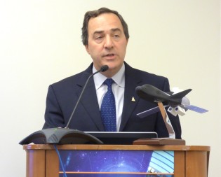Mark Sirangelo, head of Sierra Nevada Space Systems, discusses the company's Dream Chaser cargo vehicle at a press conference in Washington on March 17. On the podium is a model of the vehicle. Credit: SpaceNews photo by Jeff Foust