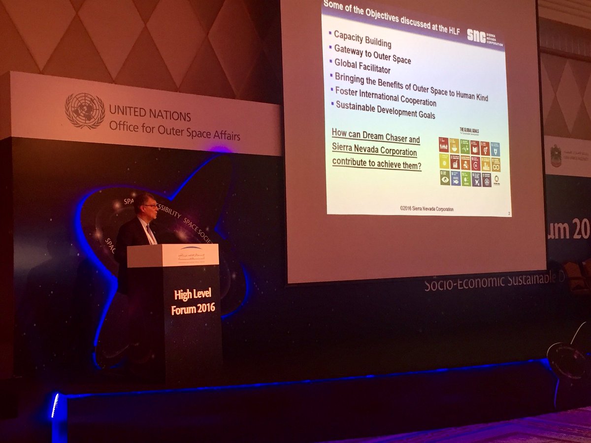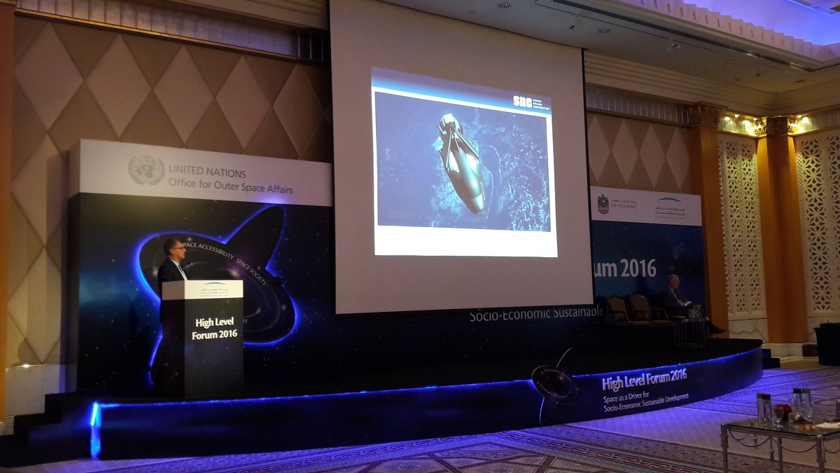 At #HLF, @SierraNevCorp presents the #SNCDreamChaser, which will be used in our partnership w SNC 2 launch 1st UN space mission #space4sdgs