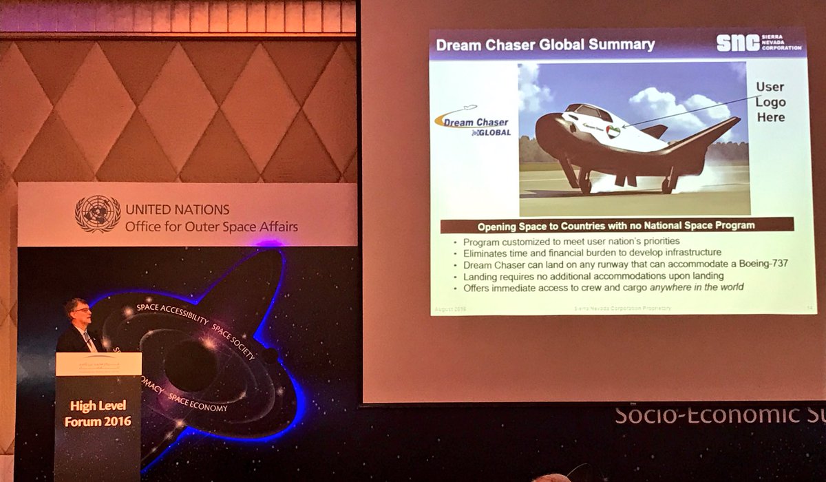 NASA or the US Government does not own the vehicle, so we can do other things with it. We could contract it out to other countries who would like to have a space program, other space agencies, companies that may want to do manufacturing in space. So one of the ideas we came up with to show how Dream Chaser could do good for the world was our new partnership with the United Nations Office for Outer Space Affairs.