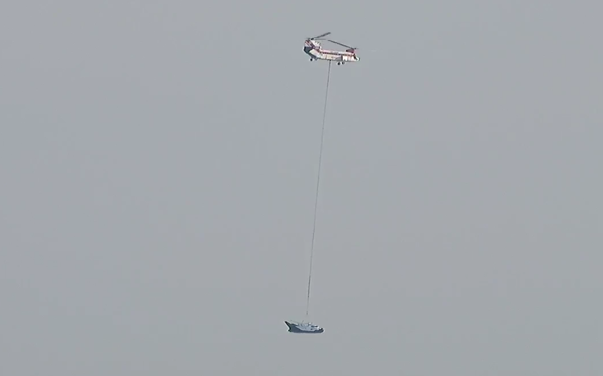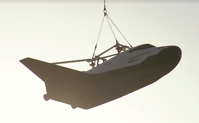 The automated spacecraft was lifted airborne Wednesday by a dual-rotor Boeing Vertol 234 helicopter operated by Columbia Helicopters. The "captive carry" test flight was expected to be used to test out telemetry and control systems before a planned drop test later this year to demonstrate Dream Chaser's ability to make an autopilot approach and landing to a runway.