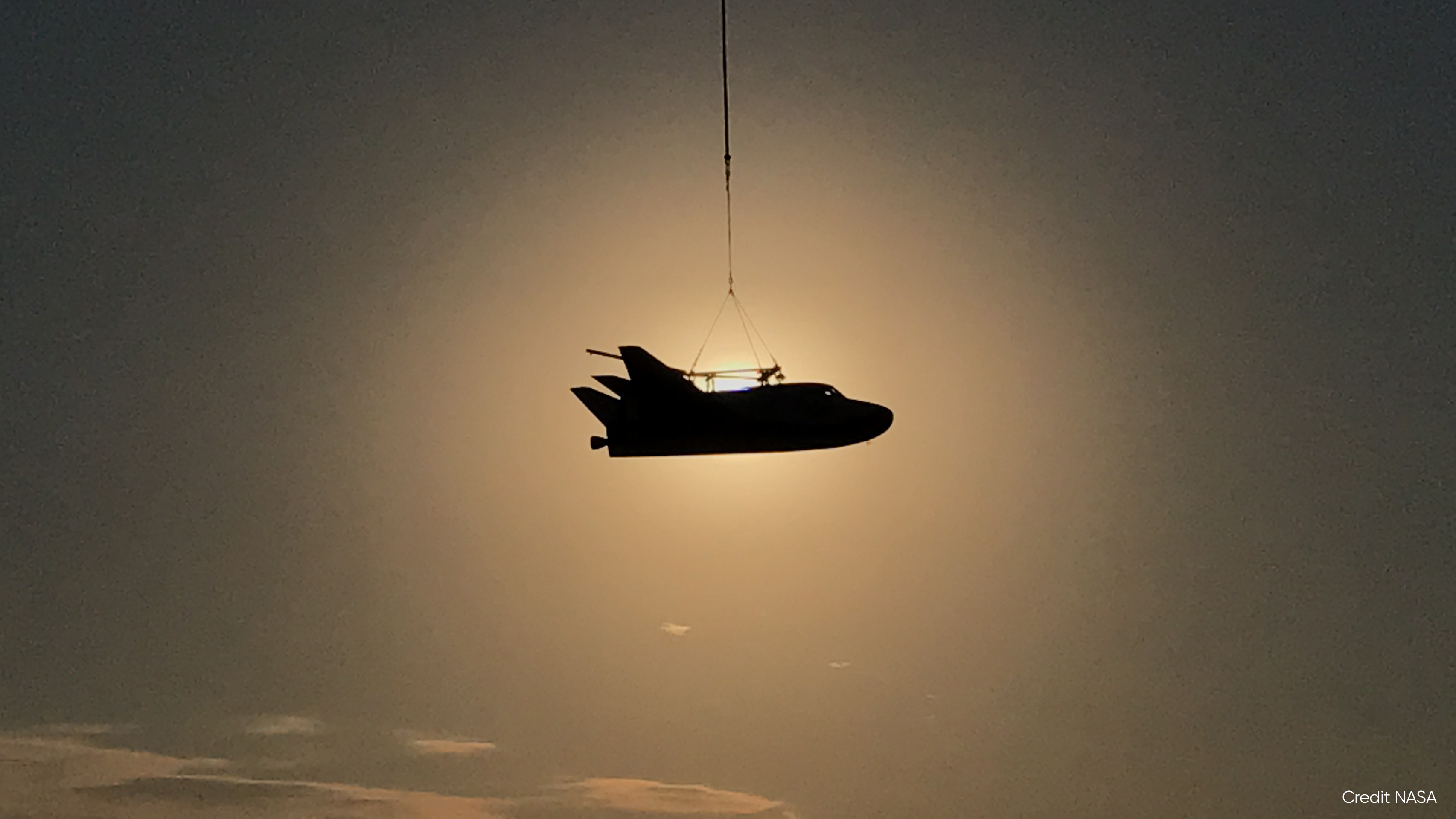 Suspended under a 200-foot lift line, the 30-foot-long (9-meter) test craft flew around the dry lake bed at Edwards Air Force Base, making several high-speed and high-altitude passes to test out the ship's aerodynamics and simulate the conditions needed during the approach and landing demonstration later this year.