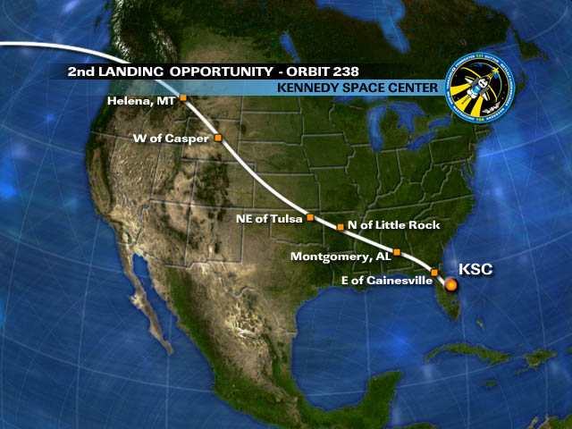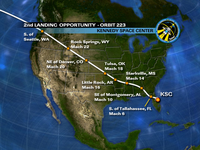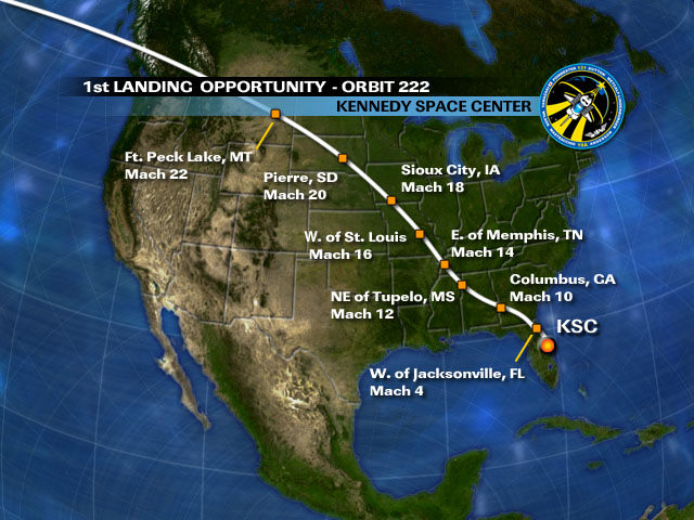 Перенесли на виток по погоде. Тормозной импульс намечен на 16:02 лмв, посадка на мысе в 17:08. Альтернативный вариант с заходом на а/б Эдвардс: импульс в 15:56, посадка в 17:01.