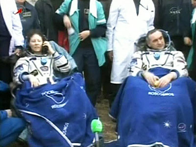 "Союз ТМА-18" в 09:23 доставил на Землю экипаж МКС- 23/24 - россиян Александра Скворцова, Михаила Корниенко и астронавта НАСА Трейси Колдуэлл-Дайсон. Сейчас в районе посадки температура около 10 градусов тепла, ветер юго-восточный с порывами 3-5 м/сек. Чтобы космонавты не замерзли, им предложили горячий чай, усадили в кресла и укрыли теплыми одеялами. "Дело в том, - пояснили в ЦУП, - что после выхода из космического аппарата система обогрева скафандров не работает, автономные источники питания в них не предусмотрены".