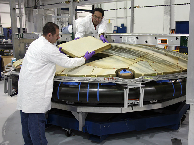 Test placement of the flight PICA-X tiles on the first flight Dragon heat shield carrier structure. During reentry the lightweight tiles withstand temperatures as high as 2000 degrees Celsius (3620 degrees F). Credit: SpaceX / Roger Gilbertson.
