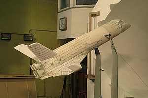 Photo: A model of the reusable winged rocket stage of the in-development MRKS-1 system in the UT-1M wind tunnel of the TsAGI Central Aerohydrodynamic Institute