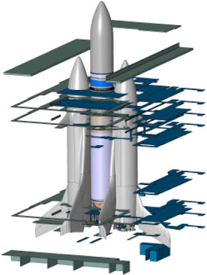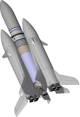 ЦитироватьIn the framework of Advanced Space Transportation Systems Studies sponsored by CNES in 2006, a study called "BARGOUZIN" was performed by a joint team led by ASTRIUM ST and TSNIIMASH. Beyond these leaders, the team comprised MOLNIYA, DASSAULT AVIATION and SNECMA as subcontractors.The "BARGOUZIN" concept is a liquid fuelled fly-back booster (LFBB), mounted on the ARIANE 5 central core stage in place of the current solid rocket booster. The main originality of the concept lies in the fact that the "BARGOUZIN" features a cluster of VULCAIN II engines, similar to the one mounted on the central core stage of ARIANE 5. An astute permutation strategy, between the booster engines and central core engine is expected to lead to significant cost reductions. The following aspects were addressed during the preliminary system study:•engine number per booster trade-off/abort scenario analysis,•aerodynamic consolidation,•engine reliability,•ascent controllability,•ground interfaces•separation sequence analysis,•programmatics.These topics will be briefly presented and synthesized in this paper, giving an overview of the credibility of the concept.