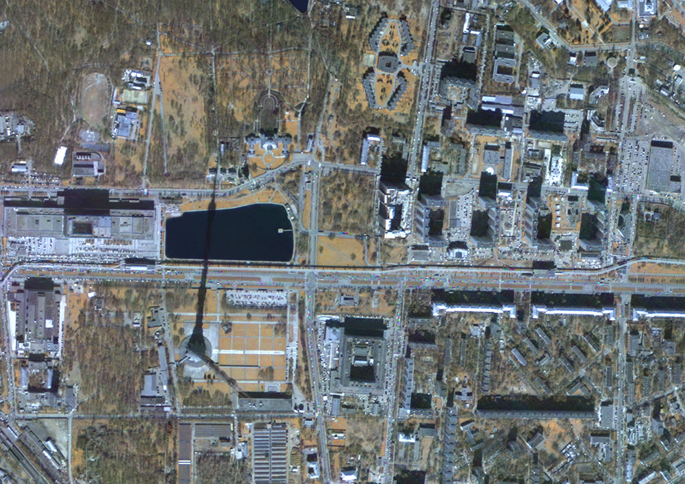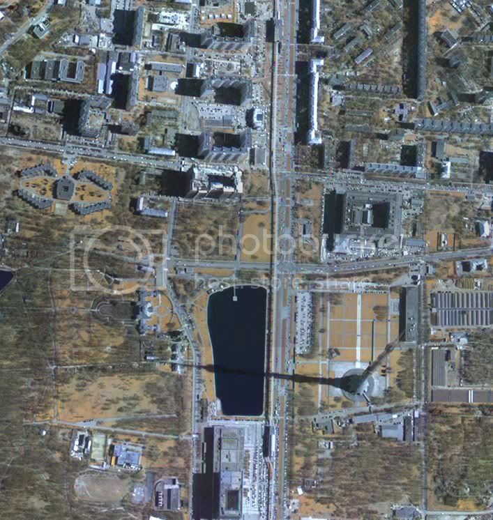 Кстати, в верхней части снимка - ряд сооружений, чем-то напоминающий по форме DrWeb'овского паучка - это коттеджный посёлок космонавтов. Сейчас там, конечно, живут не только космонавты. :)