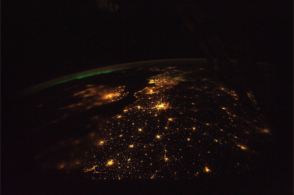 Aurora Borealis in the distance on this beautiful night over Europe. The Strait of Dover is pretty clear as is Paris, the City of Lights. A little fog over the western part of England and London. It is incredible to see the lights of the cities and small towns against the backdrop of deep space. I am going to miss this view of our wonderful world... (11-8-2010)