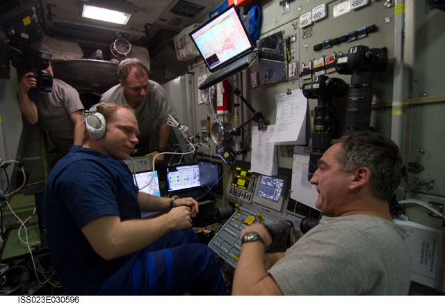 ЦитироватьRussian cosmonaut Oleg Kotov (left foreground), Expedition 23 commander, is pictured at the manual TORU docking system controls in the Zvezda Service Module of the International Space Station shortly after conducting a manual control docking of the Progress 37 due to a jet failure on the Progress that forced a shutdown of the Kurs automated rendezvous system. Progress 37 docked to the Pirs Docking Compartment at 2:30 p.m. (EDT) on May 1, 2010, after a three-day flight from the Baikonur Cosmodrome in Kazakhstan. Also pictured are NASA astronauts Tracy Caldwell Dyson (left background) and T.J. Creamer; along with Russian cosmonaut Alexander Skvortsov (right foreground), all flight engineers.