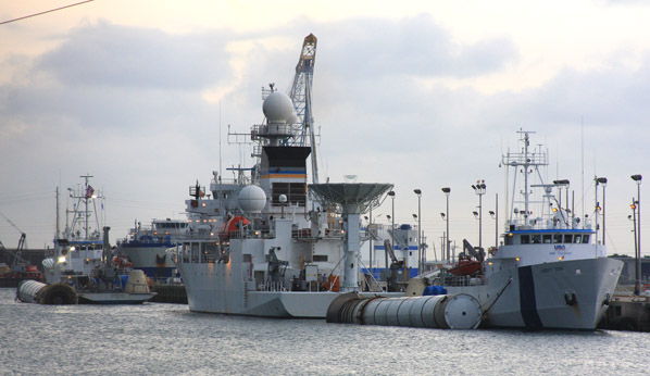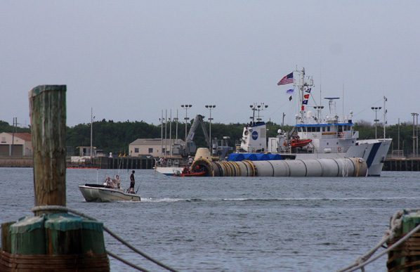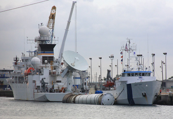 A few hours after Atlantis docked with the International Space Station, two ships towed the shuttle's twin solid rocket boosters back into port Sunday evening.