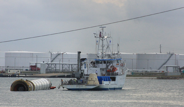 After spending the night docked at Port Canaveral, the Freedom Star and Liberty Star recovery boats tugged the boosters up the Banana River to Hangar AF at Cape Canaveral Air Force Station.