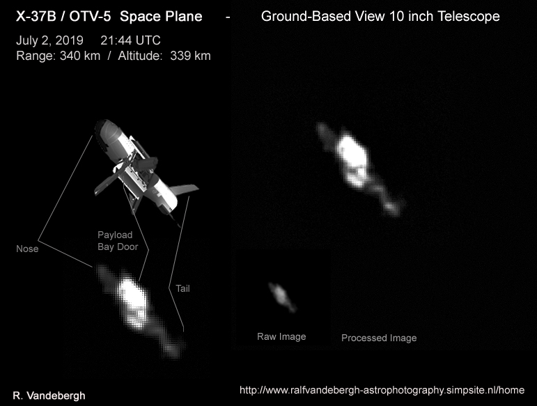 I have been hunting for the OTV-5 since months and saw it visually in May. When I tried to observe it again mid June, it didnt meet the predicted time and path. It turned out to have maneuvered to another orbit. Thanks to the amateur satellite observers-network, it was rapidly found in orbit again and I was able to take some images on June 30 and July 2. This most recent pass was almost overhead. The OTV is a small version of the classic Space Shuttle, it is really a small object, even at only 300 km altitude, so dont expect the detail level of ground based images of the real Space Shuttle. Considering this, the attached images succeeded beyond expectations. We can recognize a bit of the nose, Payload Bay and tail of this mini-shuttle with even a sign of some smaller detail.
