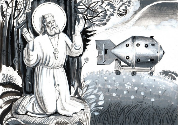 Советская атомная бомба родилась в кельях Саровского монастыря, посреди облупленных фресок были развёрнуты лаборатории, и Спас Нерукотворный из купола заброшенной церкви смотрел, как собирается реактор боевого плутония. С тех пор покровителем саровских атомщиков является преподобный Серафим.