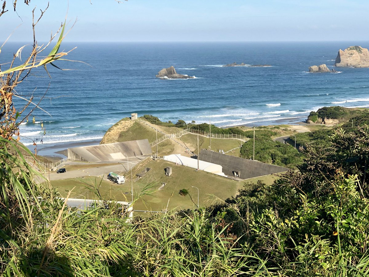 今日は、種子島宇宙センターに来ています。開発中の「H3」ロケットに装着される、新型の固体ロケット・ブースター「SRB-3」の地上燃焼試験の取材です。写真中央に見える、コンクリートに囲まれた白い箱の中にSRB-3が入っています。試験前に箱が移動して機体が外に出て、海側に向けて噴射されます。