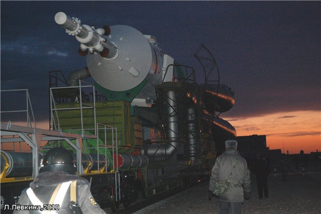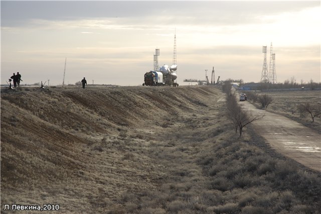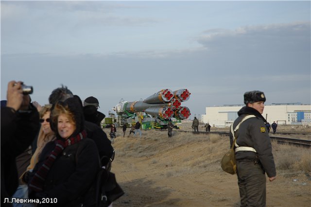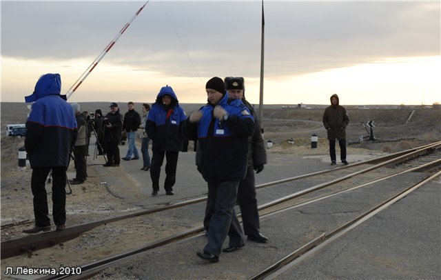 Подъехал автобус с надписью «Центр подготовки космонавтов имени Ю.А. Гагарина», и на переезде стало весьма людно и оживлённо. Репортёры в поисках наилучшего ракурса старательно расставляли свою мощную аппаратуру. Было бы здорово, если бы оба экипажа космонавтов приехали в этом автобусе, чтобы посмотреть на свою ракету, но нам довелось повидаться и сфотографироваться только с дублёрами - Александром Самокутяевым и Андреем Борисенко. Ну и правильно, основной экипаж нужно оберегать от толпы, чтобы перед стартом на космонавтов не начихали инфекцией и вообще не порвали их на сувениры.