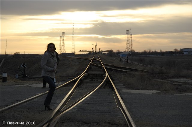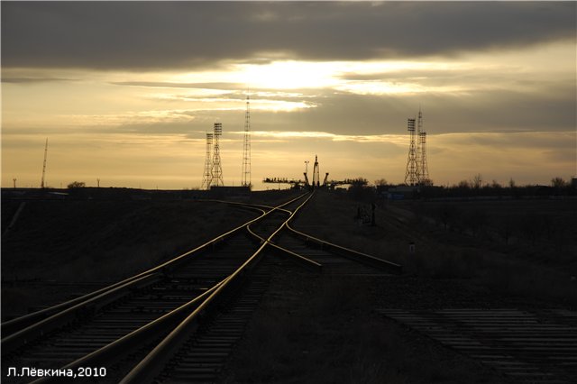 Какое место! Гагаринский старт - как на ладони! Эффектно освещённые приглушённым облачной пеленой солнцем рельсы влекли прямо к легендарной пусковой установке. А какое сегодня небо! Утренние облака заволокли его так вдохновенно, что оно сделалось грандиозно торжественным, наполненным таинственным светом, ниспадающим лучистым веером прямо на Гагаринский старт. Распахнув фермы, стартовая площадка № 1 ожидала ракету. «Тюльпан» - так ее называют. Не ракету, а гениальную своей простотой конструкцию, удерживающую на старте ракету, пока она не начнет подниматься. Нам не довелось увидеть во всей красе цветущую байконурскую степь, усыпанную яркими и жизнерадостными тюльпанами (они ещё не взошли), но что может быть прекраснее созерцания «тюльпана» накануне пилотируемого пуска!