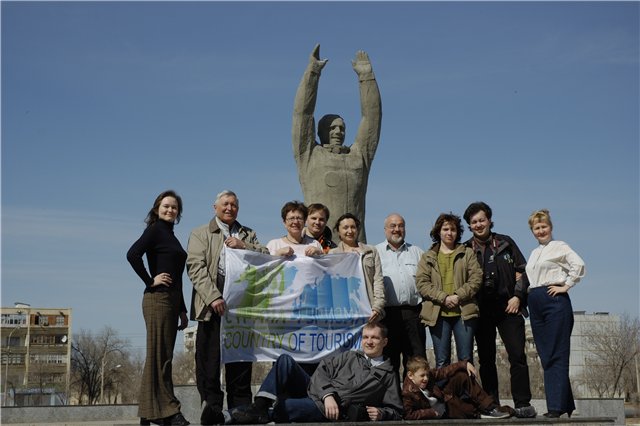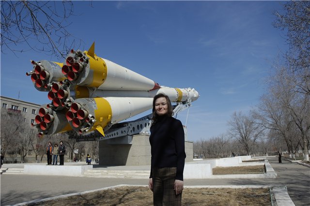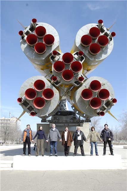 Ну а далее последовал целый ряд остановок и фотосессий: у памятника Ю.А. Гагарину в сквере; у монумента «Ракета-носитель «Союз», установленного в честь 20-летия космической эры (увлекательный и не менее трудоемкий процесс наших групповых построений и перестроений под двигателями ракеты вызвал неподдельное любопытство местного населения и, похоже, был принят за увлекательный сюжет телевидением – иначе, чего нас было снимать на камеру); у памятника М.К. Янгелю и его зелёной ракеты 15А15.