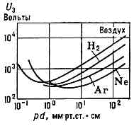 Зависимость потенциала зажигания U3 от pd для разл. газов (р — в мм рт. ст., d — в см).