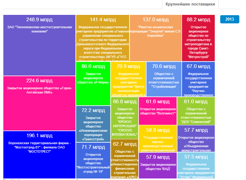 [/li][li]Из обнародованных Кудриным на пресс-конференции цифр выяснилось, что крупнейшим (проект "ГосЗатраты", разумеется, видит только закупки и заказы, не являющиеся гостайной) госзаказчиком страны является "Роскосмос": за 2013 год он закупил товаров, работ и услуг на 730 млрд руб., опередив даже Минобороны (561 млрд руб)....
