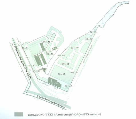 Ситуационный план земельного участка с обозначением объектов недвижимости, принадлежащих ОАО "ЦКБ "Алмаз" за 2000 и 2012 год.
