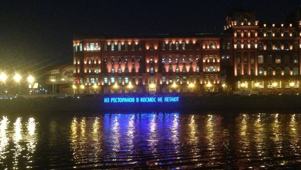 ЦитироватьМОСКВА, 12 апр — РИА Новости. Световая инсталляция Сергея Браткова, увековечившая фразу Юрия Гагарина "Из ресторанов в космос не летают", откроется в пятницу вечером, в День космонавтики, на Берсеневской набережной в Москве, сообщили РИА Новости в пресс-службе галереи Red October.