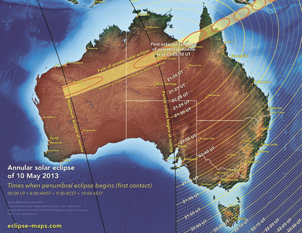 Схема начала кольцеобразного солнечного затмения 10.05.2013. Карта Michael Zeiler