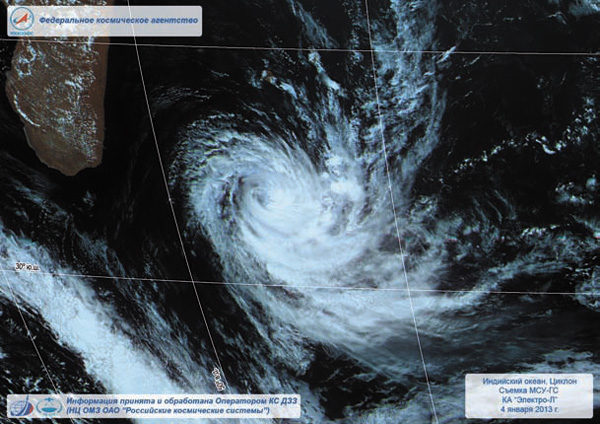 Циклон, Индийский океан. 4 января 2013 год. Съемка КА «Электро-Л». Изображение НЦ ОМЗ
