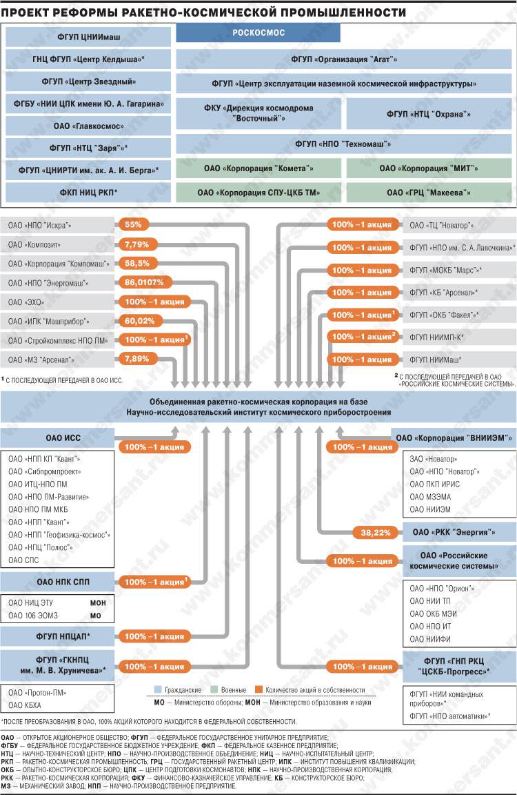 Ракетно-космическая корпорация "Энергия" передаст в ОРКК 38,22% своих акций и будет по-прежнему заниматься разработкой и изготовлением космических кораблей и орбитальных станций (а также аппаратов иного назначения). Три ФГУПа — Государственный космический научно-производственный центр им. Хруничева (разработка и изготовление ракет-носителей, орбитальных станций), Научно-производственный центр автоматики и приборостроения (разработка бортовых средств управления для ракетно-космической техники) и Государственный научно-производственный ракетно-космический центр "ЦСКБ-Прогресс" (разработка, изготовление ракет-носителей и аппаратов) — для того, чтобы также быть включены в ОРКК на правах субхолдингов, будут акционированы. При этом к ГКНПЦ им. Хруничева отойдут две крупнейшие "фирмы" по производству ракетных двигателей — пермский "Протон-ПМ" и воронежское Конструкторское бюро химавтоматики, а к "ЦСКБ-Прогресс" — НИИ командных приборов и НПО автоматики.
