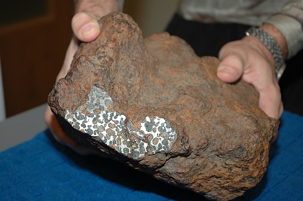 Снаружи камень не представлял собой ничего особенного. Но фермер поддался странному внутреннему порыву, отпилил его край и увидел зелёные кристаллы оливина, пронзившие железо-никелевую толщу.