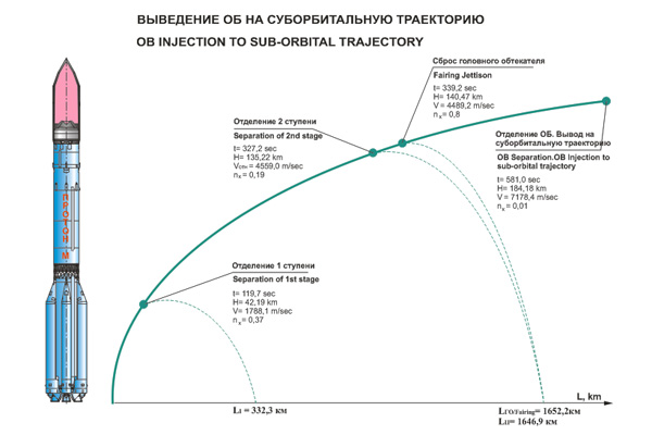 Отделение первой и второй ступеней осуществляется на 120 и 328 секундах от сигнала КП соответственно.