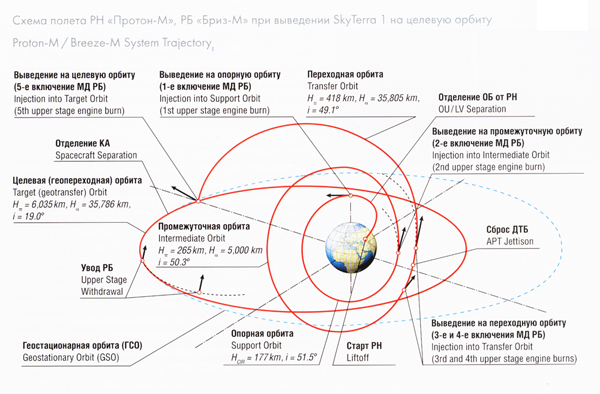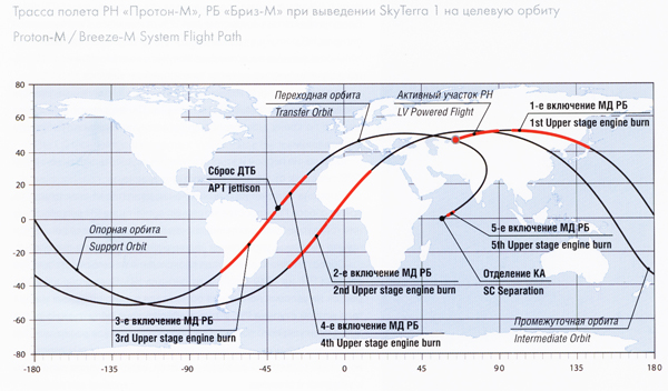 Первые три ступени ракеты-носителя "Протон-М" выводят орбитальный блок (ОБ) в составе РБ "Бриз-М", переходной системы и КА SkyTerra 1 на суборбитальную траекторию, обеспечивающую наклонение опорной орбиты i = 51,5°.