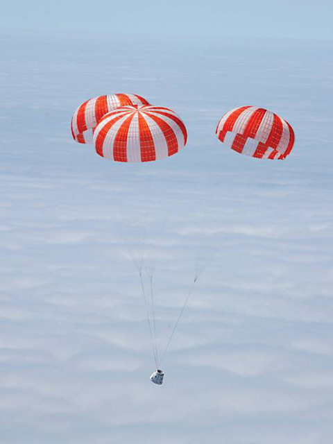 Two redundant drogue parachutes and three main chutes will slow the craft to a gentle landing in the Pacific Ocean a few hundred miles off the coast of California.