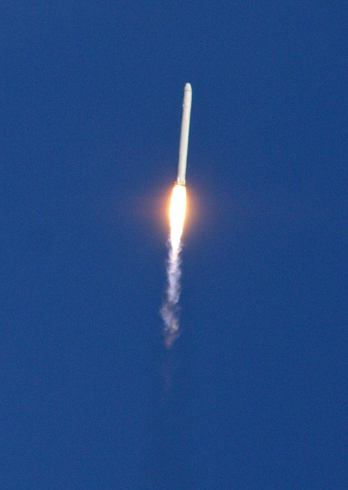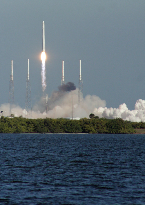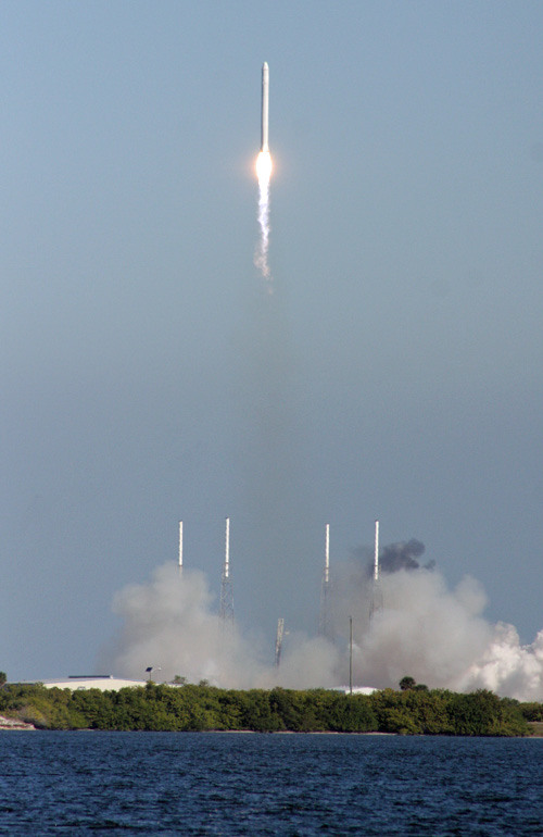 The first stage fell away as planned just over three minutes into flight. A NASA recovery ship will attempt to retrieve it from the Atlantic Ocean.